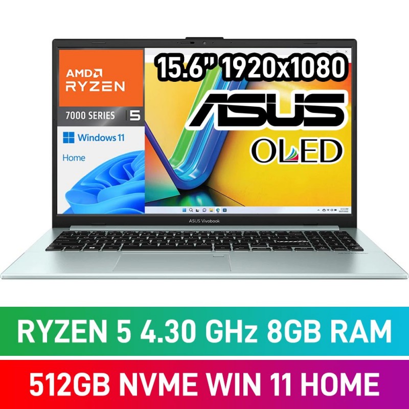 ASUS VivoBook Go E1504FA E1504FA-O58512GR0W Laptop — Ryzen 5 7520U / 15.6" FHD OLED / 8GB DDR5 RAM / 512GB NVMe SSD / Windows 11 Home / Green Grey