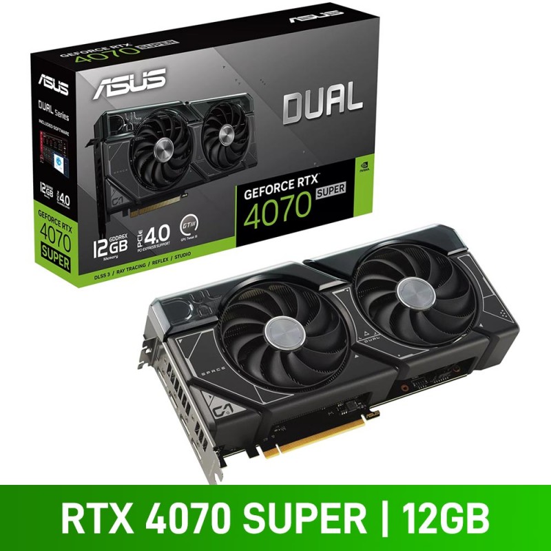 ASUS Dual GeForce RTX 4070 SUPER OC Edition 12GB GDDR6X with two powerful Axial-tech fans and a 2.56-slot design for broad compatibility