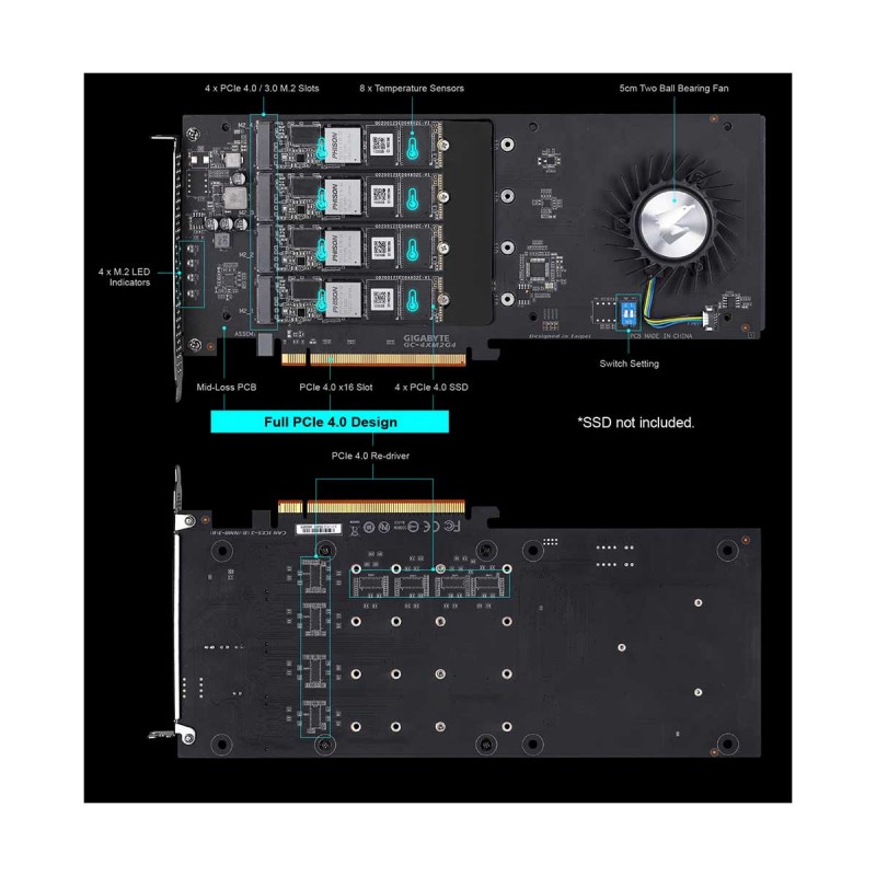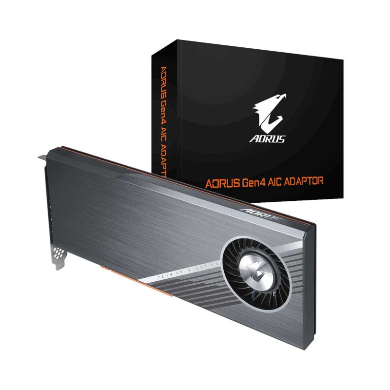 With AORUS Gen4 AIC Adaptor and 4 PCIe 4.0 2TB SSD, Read/Write performance reaches amazing 15,000 MB/s. AORUS Gen4 AIC Adaptor equips very advanced thermal solution, including 5.5mm pure copper heatsink, 5cm double ball bearing fan, M.2 SSD baseplate and multiple thermal pads to cool down both sides of 4 M.2 high performance SSD with active cooling. Users can choose 3 different fan profile based on hardware configuration to reach perfect balance of high storage performance and low noise.