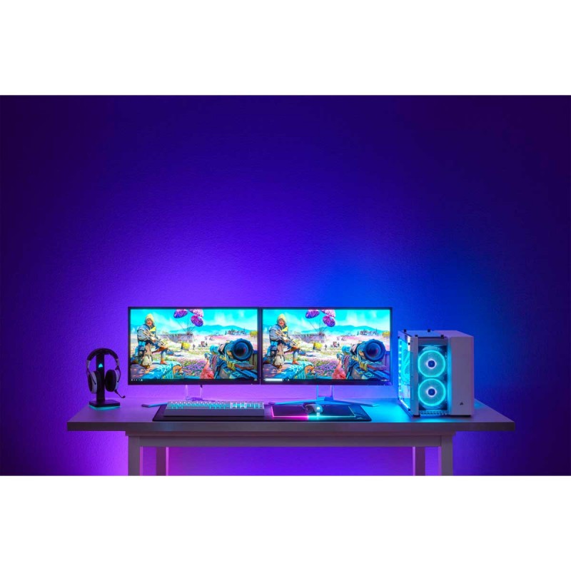 Extend your RGB lighting beyond your PC with the CORSAIR iCUE LS100 Smart Lighting Strip Starter Kit, radiating diffused ambient lighting that synchronizes with your system, games and media.