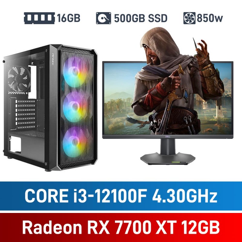 Intel Core i3-12100F / Radeon RX 7700 XT / 16GB RGB DDR4-3600 / 500GB NVMe SSD Budget Gaming PC