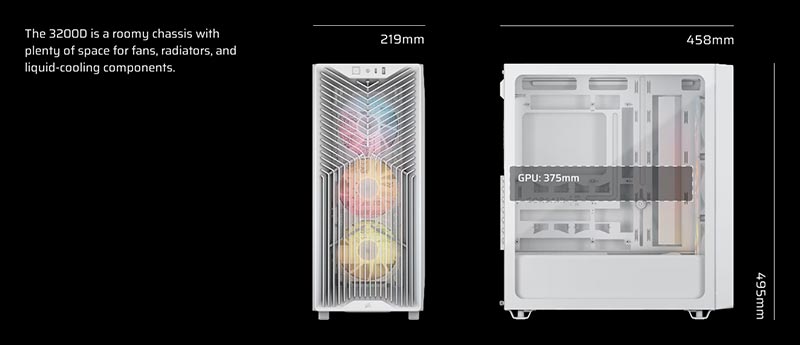 The 3200D is a spacious mid-tower chassis designed for modern GPUs. With 375mm of clearance with front fans installed, even the most powerful GPUs have plenty of room to breathe. The PSU shroud also features 2x 120mm fan mounts, with the front one being angled directly at the GPU, providing even more cooling power for the hottest GPUs.