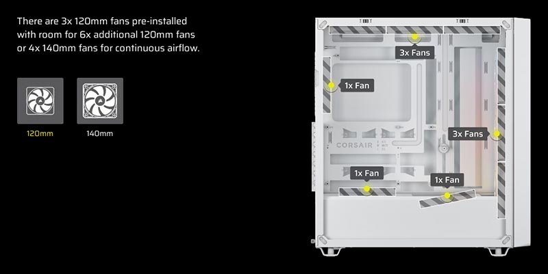 | Fan Support | Front: 3 x 120mm / 2 x 140mm (3 x 120mm ARGB fans included) |