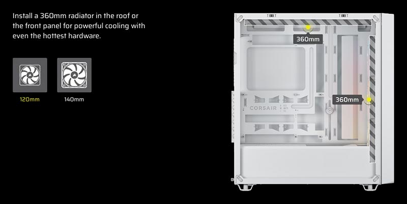 The CORSAIR 3200D is made to keep the hottest components cool with 2x 360mm radiator mounting locations and fan mounts throughout the chassis for continuous airflow.