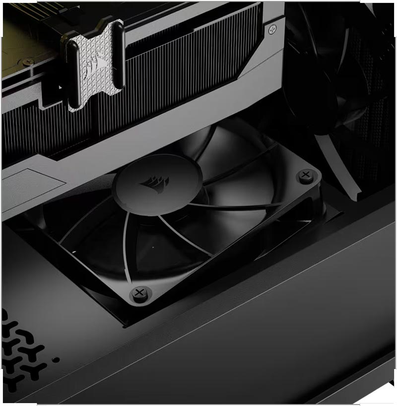 An angled fan mount in the bottom of the case allows cool air to be channeled directly at the GPU for improved cooling and better GPU temps.