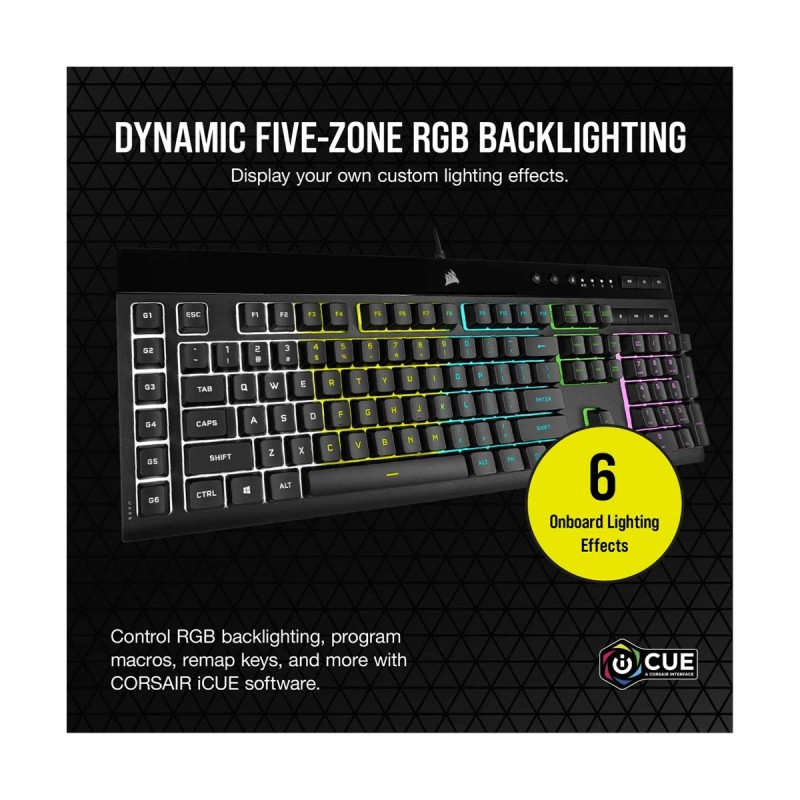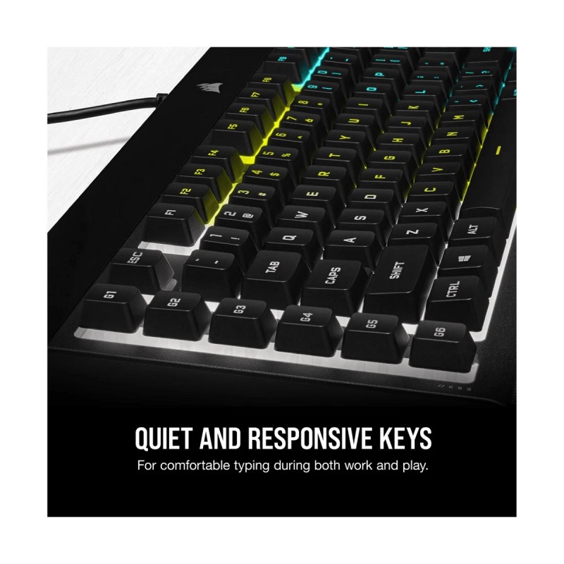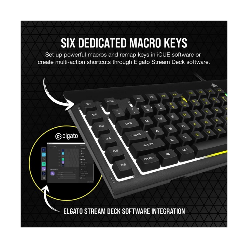 The CORSAIR K55 PRO LITE RGB Gaming Keyboard lights up your desktop with five-zone dynamic RGB backlighting and powers up your gameplay with six dedicated macro keys. Customize with six onboard lighting effects, assign a color to each lighting zone, or program your own vibrant lighting effects across five RGB lighting zones with CORSAIR iCUE software. IP42 protection guards your keyboard against spill accidents and dust buildup so your gameplay never stops. Gain an in-game advantage with six dedicated macro keys - record onboard, program more complex macros through iCUE, or assign streaming commands through Elgato Stream Deck software.