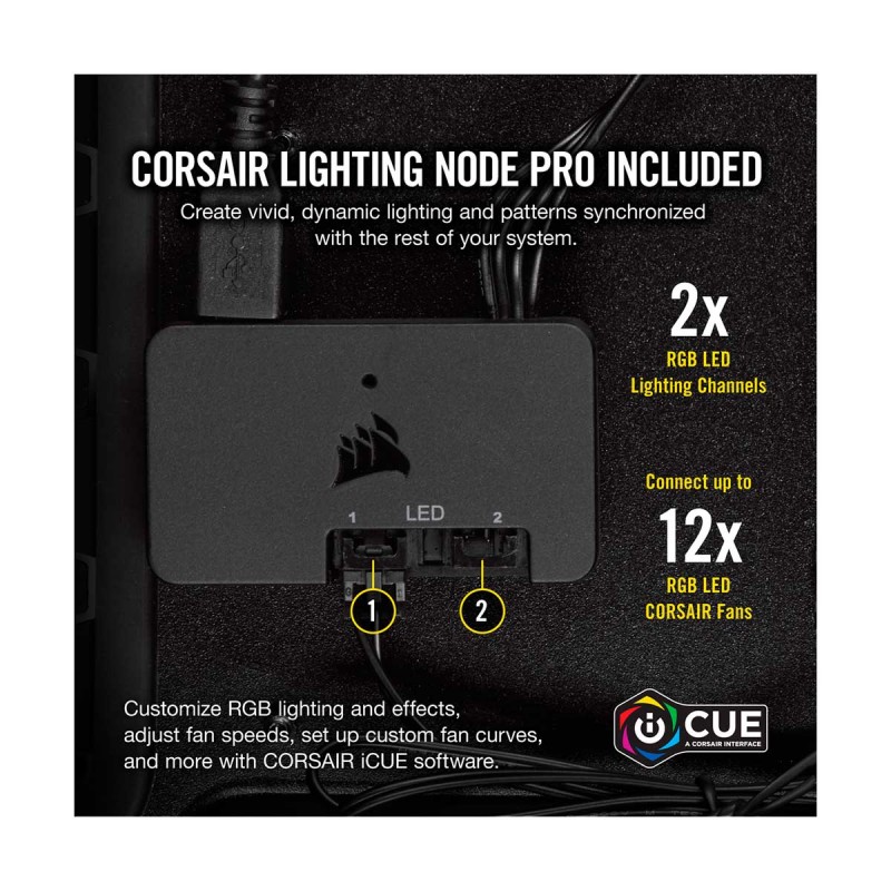 Made for those seeking excellent airflow, quiet operation, and powerful lighting, the CORSAIR LL120 RGB fan puts your PC back in the loop. The CORSAIR LL120 RGB LED PWM fan boasts 16 independent RGB LEDs across two separate light loops to create vibrant lighting and visual effects. 16 Independent RGB LEDs in every fan, split between two separate light loops, allow for nearly endless customization. The included CORSAIR Lighting Node PRO enables stunning dynamic lighting effects with other CORSAIR iCUE supported devices. Dynamically control fan speed from 600 RPM to 1,500 RPM to minimize noise or maximize airflow.