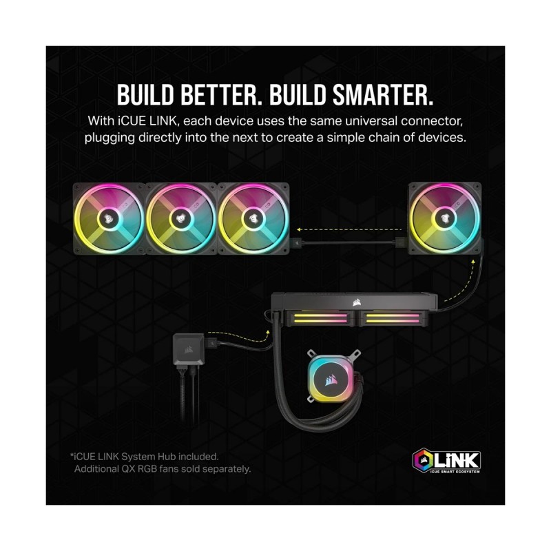 Redefine the way you build a DIY PC with a groundbreaking single-cable technology that automatically detects and configures your PC fans, CPU coolers, and other internal components. Reduce cable clutter with a network of smart, interconnected components. The iCUE LINK ecosystem uses a single connector for all iCUE LINK devices. Each component connects directly to the next, creating a chain of devices. High-performance pump head and split-flow copper cold plate. Single cable connects to included hub with automatic installation. QX RGB fans with 34 LEDs per fan and exclusive Time Warp lighting mode. Boost your processor's performance with a split-flow copper cold plate with pre-applied CORSAIR XTM70 thermal paste. QX120 RGB fans ramp up to 2,400 RPM, complete with stunning lighting and next to no wiring for a flawless look. Enjoy ultra-quiet performance under any conditions with auto-adjusting pump speeds, precisely controlled by iCUE software. Adjust fan and pump speeds, control and synchronize RGB lighting, and monitor CPU and coolant temperatures in iCUE. Included CORSAIR iCUE LINK System Hub - connect up to 14 iCUE LINK devices (seven per port) in any order. PWM control lets you precisely set fan speeds so your fans only spin as fast as they need to, resulting in less fan noise overall, while support for Zero RPM means they can stop spinning completely at low loads.