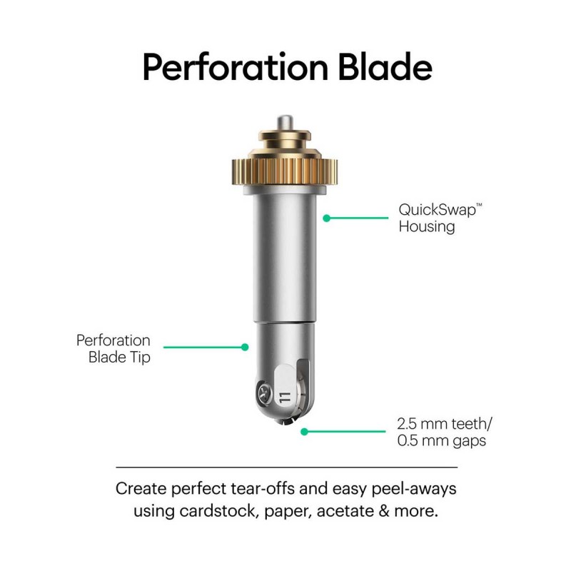 Get smooth tears quickly and effortlessly with precise perforation cuts for a wide variety of projects. To create uniform, finely perforated lines for any design, just snap this tip onto the QuickSwap Housing (sold separately) and tell your Cricut Maker to "Go!" Evenly spaced perforation lines allow for clean, even tearing without the need to fold beforehand – especially great for shapes with curves. Perfect for tear-out booklet pages, raffle tickets, homemade journals, or for any project that demands a clean tear. Easily swap out with any QuickSwap tip. For use with Cricut Maker machines. Expand your collection of Cricut Maker tools with a variety of QuickSwap tips. Just swap out Basic Perforation Blade with any other QuickSwap tip, including Engraving Tip, Debossing Tip, Scoring Wheels, and Wavy Blade – with more on the way.