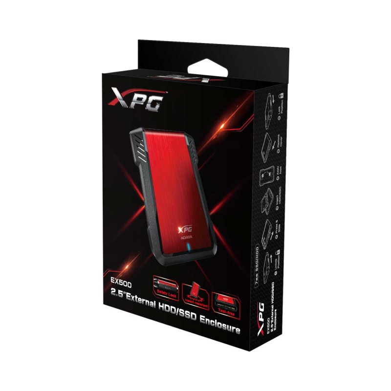 No more bland enclosures. Turn any 2.5” SSD or HDD into extra gaming storage with a design that pops out from the crowd. This is an enclosure for gamers, made fast, tough, and classy with tool-free install and instant plug n game. Dedicated controller maximizes USB 3.2/SATA 6Gb/s conversion efficiency. Install and load even the biggest games with no compromise : virtually identical to internal storage. Any 2.5” SSD/HDD takes literally minutes to install – no tools or screws needed. Flick the switch securely lock the EX500 and unlock it for quickly swapping drives. Remove the lock mechanism and reinsert it as needed – you’re in control. Tested against drops from desktop height – your games will survive rough treatment.