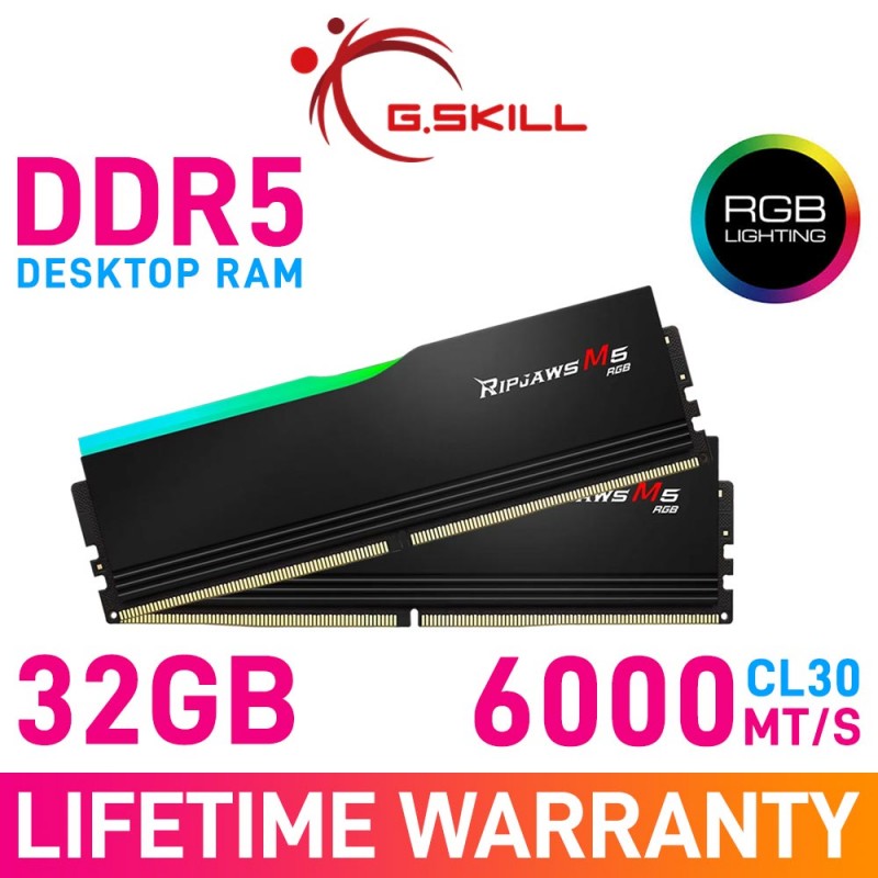 G.Skill RIPJAWS M5 RGB 32GB (2 x 16GB) DDR5 DRAM 6000MHz CL30 1.35V F5-6000J3040F16GX2-RM5RK Memory Kit — Black
