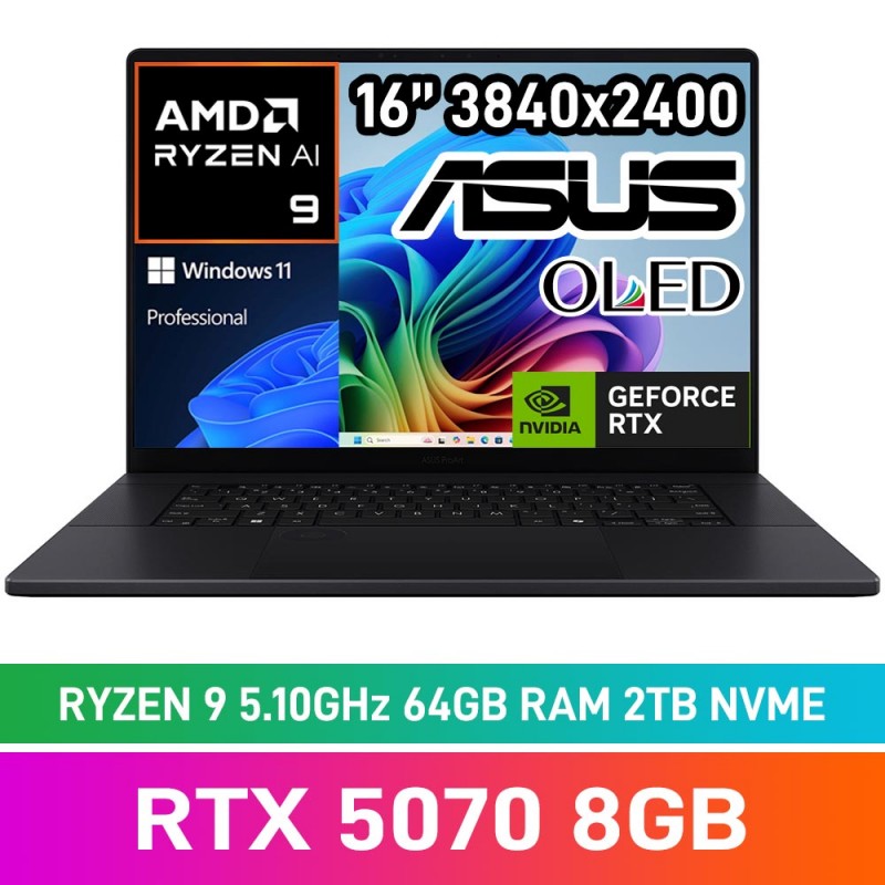 ASUS ProArt P16 H7606WP-O96420B0X Laptop — Ryzen AI 9 HX 370 / 16" WQUXGA OLED Touchscreen / 64GB DDR5 RAM / GeForce RTX 5070 8GB / 2TB Gen4 NVMe / Windows 11 Pro / Nano Black