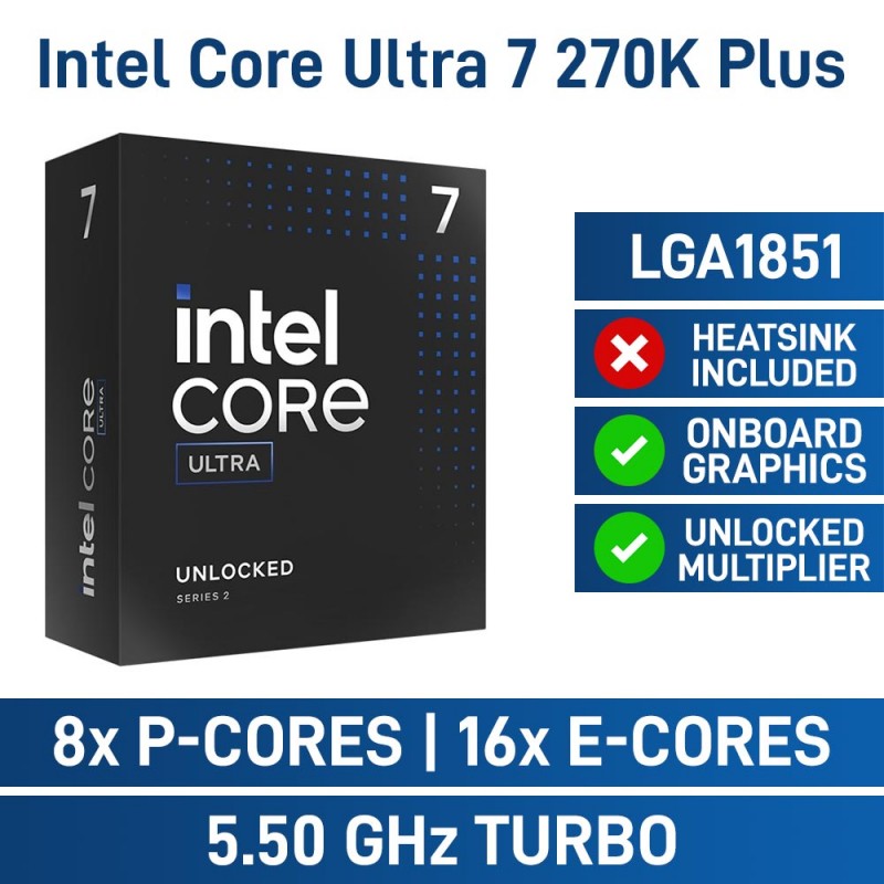 Intel Core Ultra 7 270K PLUS 24 Core CPU, No Cooler, LGA1851, 3.7GHz (5.5GHz Turbo)
