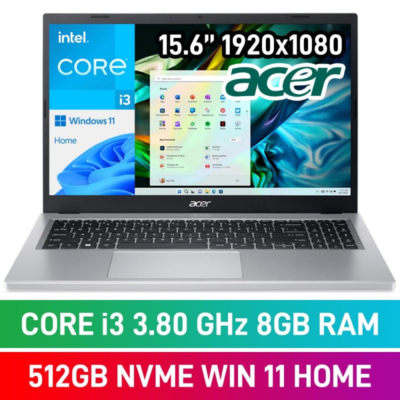 Acer Aspire 3 15 A315-510P-337G Laptop — Core i3-N305 / 15.6" FHD / 8GB DDR5 RAM / 512GB NVMe SSD / Windows 11 Home / Pure Silver