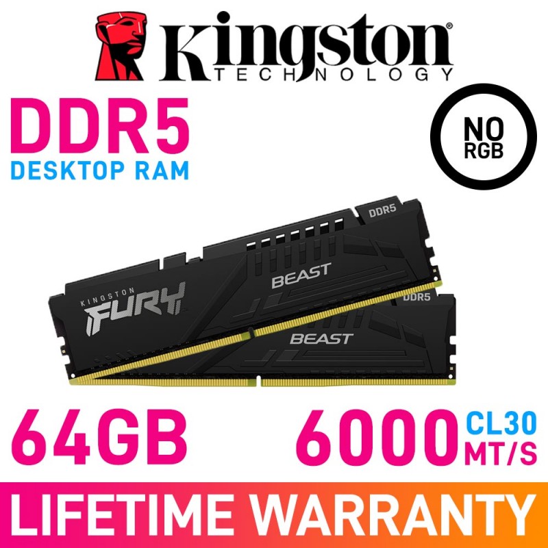 Kingston FURY BEAST DDR5 64GB (2 x 32GB) DDR5 DRAM 6000MHz CL30 1.40V KF560C30BBK2-64 Memory Kit — Black