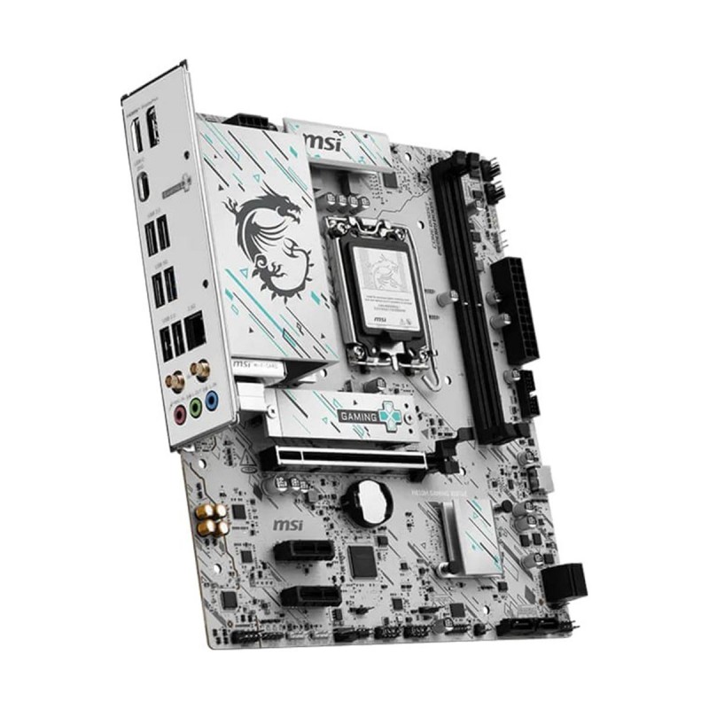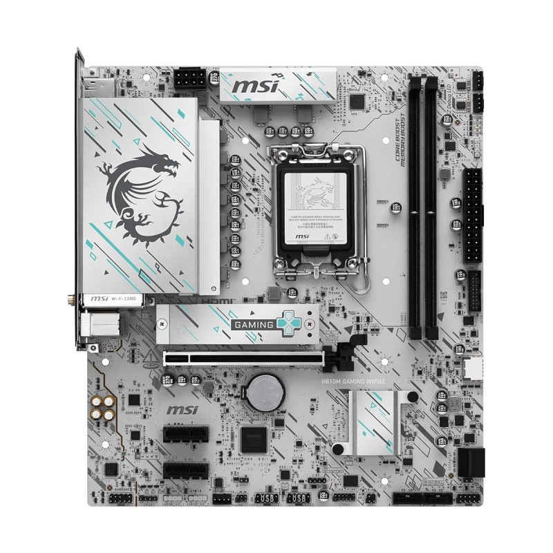 The H810M GAMING WIFI6E motherboard features a sleek, cyber-inspired pattern with teal and black geometric accents on a silver base. Featuring USB 20G Type-C port, Wi-Fi 6E, 2.5G LAN, PCIe 5.0 solution and M.2 Shield Frozr, ready for Intel Core Ultra processors. MSI motherboards are designed with advanced hardware and technology, well-supporting the demanding computing usage of gaming and AI. Moreover, we also introduce AI to MSI Center and BIOS, making everything more effortless than before.